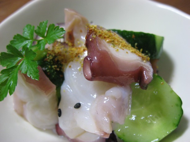 タコときゅうりを、ゴマ油、塩、酢、醤油、ラー油で和えました。