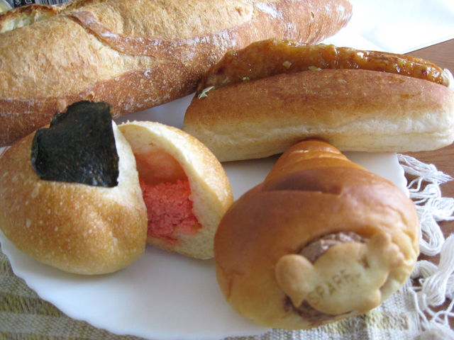 写真は、バタール、海苔の乗った辛子めんたいパン、