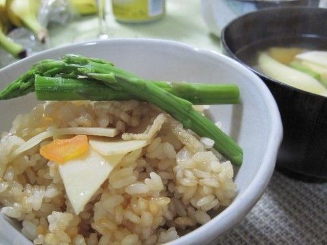 タケノコご飯 みそ汁 天ぷらって 頑張ってまーす