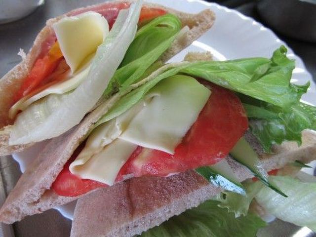 空洞ができるので、そこへ自家製トマトときゅうりなどをはさんで