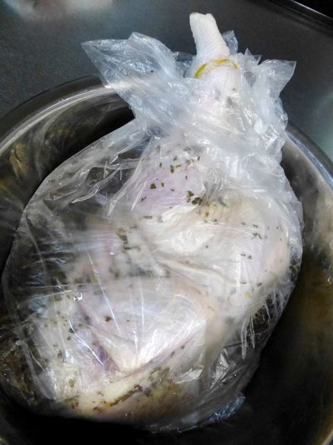 丸鶏をビニール袋に入れ、砂糖と塩を溶かしたたっぷりの水に